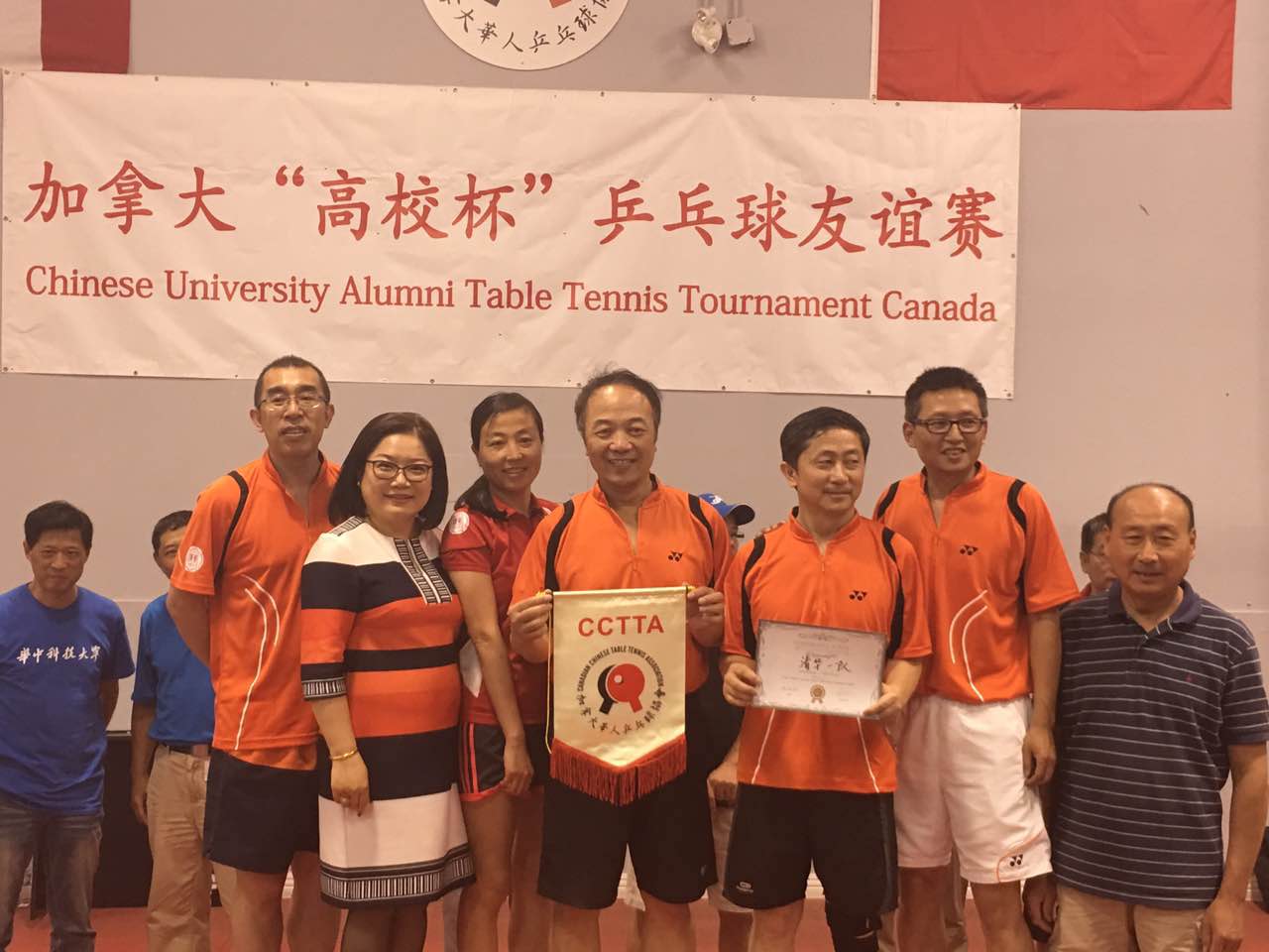 为加拿大“高校杯”乒乓球友谊赛于7月15日和16日在万锦的室内乒乓球馆进行。此次赛事由四川大学加拿大校友会主办,共有51个中国高校加拿大校友会参加,人数多达255人。南安省清华校友会派出两支队伍参赛,其中一队由队长胡晟斐(女,自动化89)带队,二队由队长赵勗罡 (电子工程91)率领。二天528场比赛,规模空前,书写了加拿大最大规模乒乓球团体比赛的历史。最后,清华1队获得了第五名。清华2队也赛出了风格和水平。整个赛事最为引人注目的队员是清华二队82岁的金其莹学长(电机54)。他不但身体灵活,而且球技精湛,丝毫不输年轻队员,并在正式比赛后获邀参加了表演赛,让广大校友们真正体会到了什么是“无体育,不清华”的精神。
