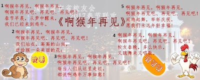 “啊猴年再见,啊猴年再见,啊猴年再见吧、再见吧、再见吧!闻鸡起舞,举杯庆祝,愿我们永远年轻幸福。”