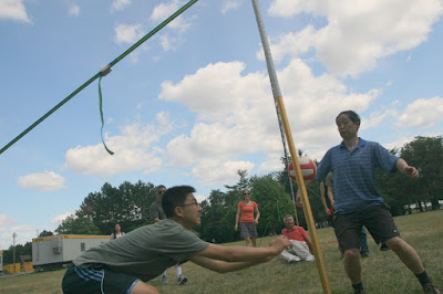 正如大家所料的,今年活动的最大亮点是我们校友自己的排球赛。因为参加的人多,分了好几组。有半专业的,也有纯业余的;有男的,也有女的;有岁数大些的,也有小字辈的。每个人都打得很起劲,也很带劲儿。裁判哨声响亮,比赛节奏激烈。有扣球,有拦网,有飞身救球,有精彩二传。打排球要的就是气氛,场边看球的比打球的还兴奋。