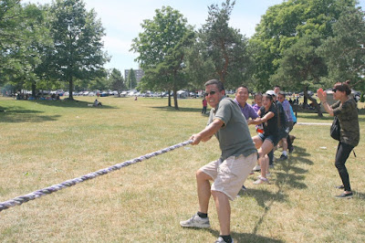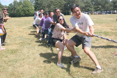 校友会带来了专业的拔河绳。开始招呼时大家还有些犹豫,可能怕伤了腰。等真的较起劲来,男女老少就齐上阵了。两组人马相争,一组以多大学生为主,另一组自然就是非多大的。有卖力拽的,有卖力喊的,有用手的,有用腰的。团结就是力量,一定是说拔河的。