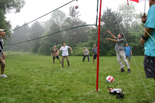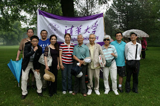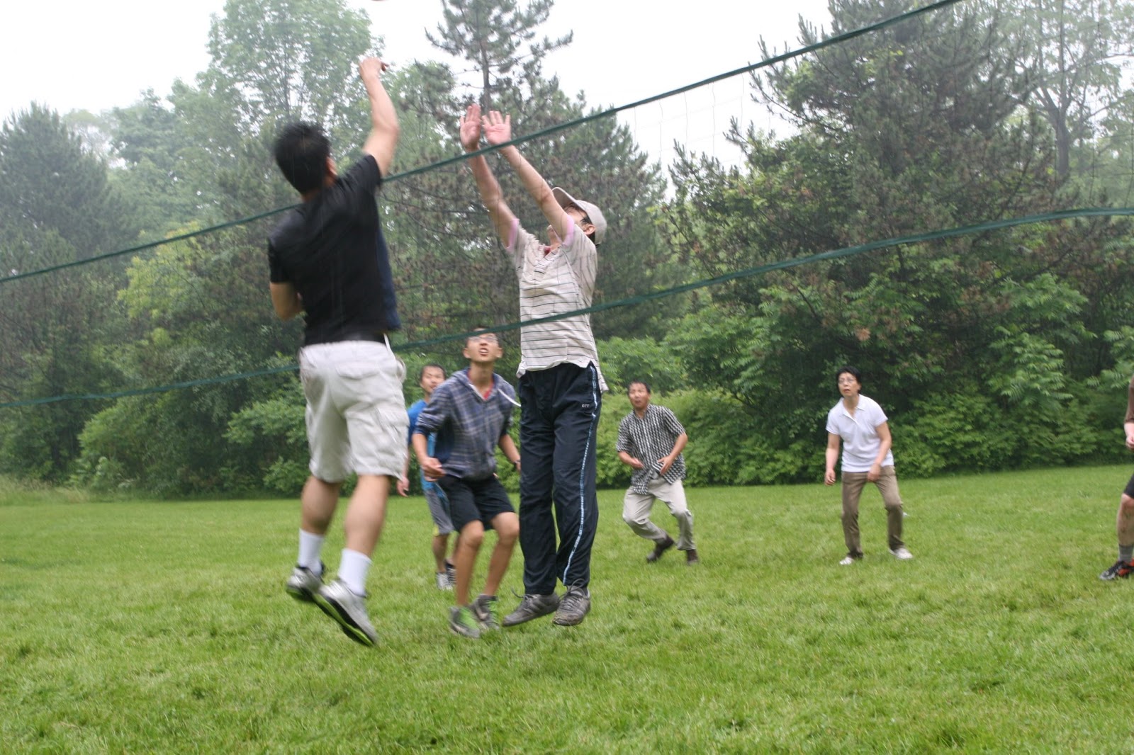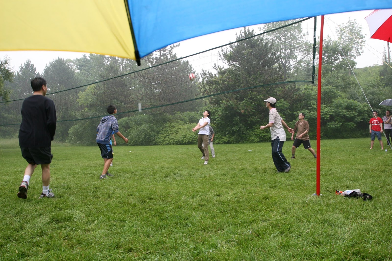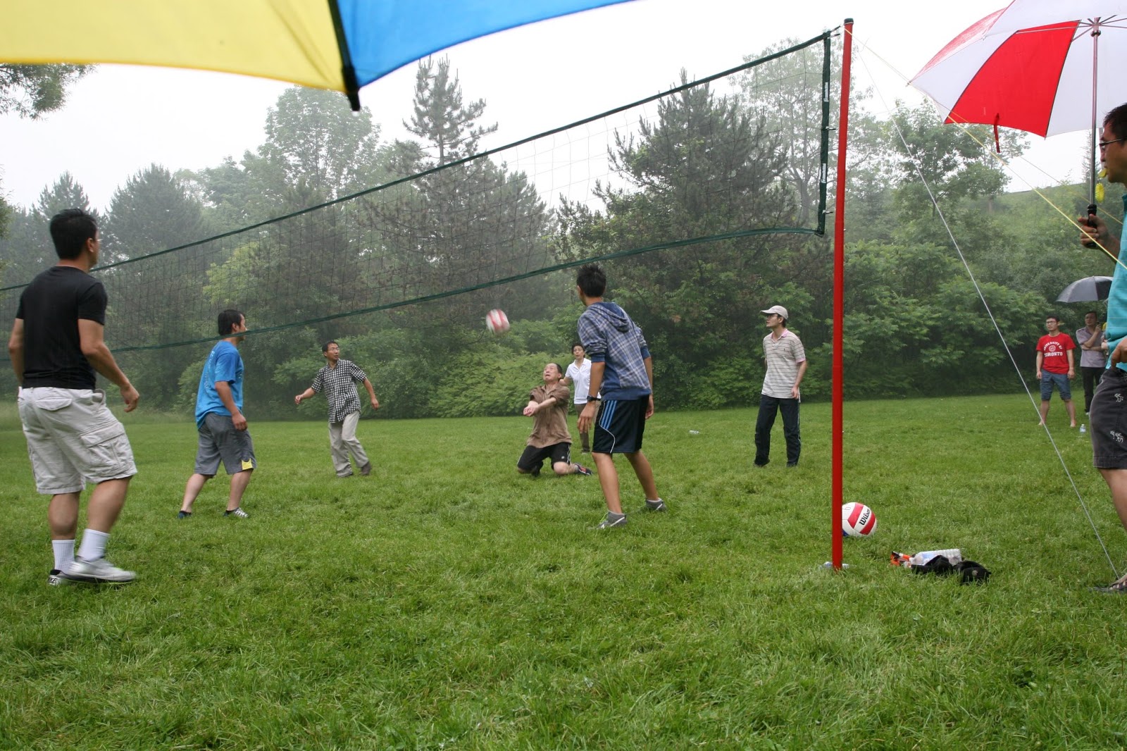 精彩还在后面。因为是四校联合举办野餐会,自然少不了校际间的活动。虽然雨没有停,有时还下得很大,排球比赛照常举行。清华校友队首战厦大校友队。虽然是临时组队,新任理事鲍博还是招来了不少排球好手,除了来自多大的年轻校友,还有象方兴、李宝松这样的老将,外加女将迈之。发球、拦网、接球、扣杀,清华队员个个身手不凡,配合也很默契。在雨中,队员们奋力比赛。在场外,清华校友的拉拉队撑伞助威,加油声不断。结果清华队一路领先,取得胜利。由于天气原因,赛事缩短,清华队轻松获得了首届“华夏”杯,并在另一场友谊赛中,险胜实力强大的联队。
